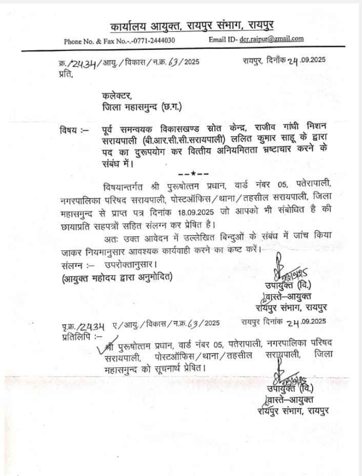 सरायपाली मामला जिला महासमुन्द के कार्यालय विकासखण्ड स्त्रोत केन्द्र, समग्र शिक्षा सरायपाली का है। बता दें आवेदक पुरूषोत्तम प्रधान ने कार्यालय विकासखण्ड स्रोत केन्द्र समग्र शिक्षा सरायपाली में सूचना के अधिकार अधिनियम 2005 तहत् अलग-अलग आवेदन कर शैक्षणिक सत्र/वर्ष 2015-16 में कार्यालय विकासखण्ड स्त्रोत केन्द्र, समग्र शिक्षा सरायपाली को कौन-कौन से कितनी-कितनी राशि प्राप्त हुआ, अलग-अलग मदवार जानकारी और विभिन्न मदों में प्राप्त राशि का खर्च/व्यय विवरण के साथ, बिल वाउचर, कैश बुक, लेजर एवं खर्च/व्यय सम्बन्धित समस्त दस्तावेजों की सत्यप्रमाणित प्रतिलिपि जानकारी चाहीं गई थी। सत्यप्रमाणित प्रतिलिपि जानकारी प्राप्त होने पश्चात् समस्त दस्तावेजों को आवेदक पुरूषोत्तम प्रधान ने जाँच-पड़ताल प्रारंभ किया, प्राप्त दस्तावेजों में शैक्षणिक सत्र/वर्ष 2015-16 में कार्यालय विकासखण्ड स्त्रोत केन्द्र, समग्र शिक्षा सरायपाली को विभिन्न मदों से राशि का व्यय/खर्च में अनेक झोलझाल प्रतित हुआ, उक्त दस्तावेजों की छायाप्रति संलग्न कर आवेदक ने माननीय मुख्यमंत्री छत्तीसगढ़ शासन, माननीय राज्यपाल छत्तीसगढ़, माननीय स्कूल शिक्षा मंत्री छत्तीसगढ़ शासन, माननीय लोकायुक्त छत्तीसगढ़ लोक आयोग, मुख्य सचिव छत्तीसगढ़ शासन, प्रमुख सचिव छत्तीसगढ़ शासन स्कूल शिक्षा विभाग, संचालक लोक शिक्षण संचालनालय छत्तीसगढ़, प्रबंध संचालक राज्य परियोजना कार्यालय समग्र शिक्षा छत्तीसगढ़, आयुक्त संभाग रायपुर छत्तीसगढ़, संभागीय संयुक्त संचालक शिक्षा संभाग रायपुर छत्तीसगढ़, कलेक्टर जिला महासमुन्द (छ.ग.), जिला मिशन समन्वयक समग्र शिक्षा जिला महासमुन्द (छ.ग.), अनुविभागीय अधिकारी (राजस्व) सरायपाली, विकासखण्ड शिक्षा अधिकारी सरायपाली को दिनांक 16/09/2025 को पूर्व समन्वयक विकासखण्ड स्त्रोत केन्द्र राजीव गांधी शिक्षा मिशन सरायपाली (बीआरसीसी सरायपाली) ललित कुगार साहू के द्वारा पद का दुरुपयोग कर वित्तीय अनियमितता, भ्रष्टाचार करने के सम्बन्ध में अनेक बिन्दुओं में लिखित शिकायत किया, जिसके सम्बन्ध में कार्यालय संभागीय संयुक्त संचालक शिक्षा संभाग रायपुर (छ.ग.) आदेश क्रमांक/सतर्कता/जांच/एफ-490 MSMD/2025/445 रायपुर 22/09/2025 के अनुसार संभागीय संयुक्त संचालक शिक्षा संभाग-रायपुर (छ.ग.) के द्वारा जिला शिक्षा अधिकारी महासमुन्द को आदेश कर शिकायतकर्ता पुरूषोत्तम प्रधान के आवेदन संदर्भ संदर्भित पत्र सह 21 पृष्ठीय दस्तावेज संलग्न कर अग्रेषित है। संदर्भित पत्र सह सहपत्र की जांच कर जांच प्रतिवेदन अपने स्पष्ट अभिमत सहित इस कार्यालय को दिनांक 29/09/2025 तक उपलब्ध कराना सुनिश्चित करने हेतु आदेशित किया गया है। इसी आदेश के परिपालन में कार्यालय जिला शिक्षा अधिकारी महा